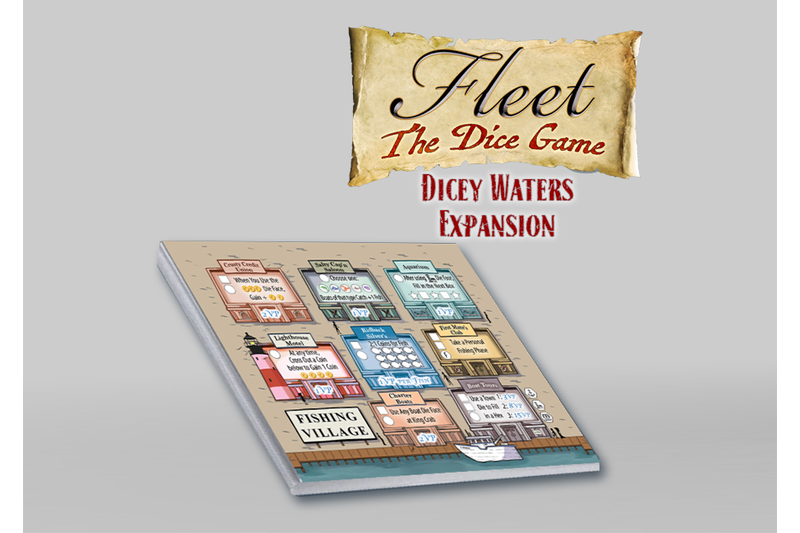 Fleet: The Dice Game - Dicey Waters Expansion adds a new full color mini-scorepad to the game with 8 new buildings in a fishing village. Each building offers new actions or abilities; and boxes in these buildings can only be marked off by not using a die for its die face and forfeiting your coin.
