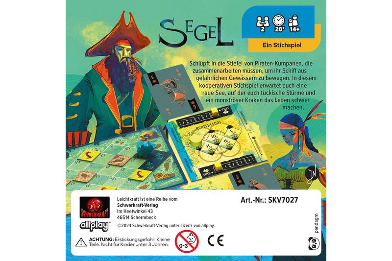 Segel ist ein kooperatives Stichspiel für 2 Spieler. Sie versuchen, die Absichten ihres Gegenüber zu erkennen und Karten auszuspielen, deren Kombination ihr Schiff antreibt oder den Kraken besiegt. Das Spiel hat zudem ein Szenarioheft mit 6 Szenarien.