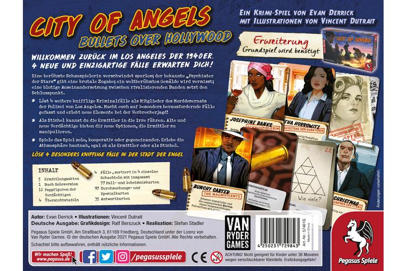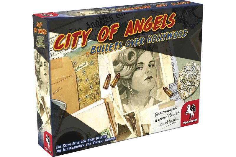 Bullets over Hollywood ist eine Erweiterung für City of Angels. Die Spieler können sich auf besonders herausfordernde Fälle gefasst machen und erleben neue Elemente bei der Verbrecherjagd! Als Stichel versucht einer der Spieler die Ermittler in die Irre zu führen. Alte und neue Verdächtige bieten dabei neue Optionen, die Ermittler zu manipulieren. Das Spiel kann solo, kooperativ oder gegeneinander gespielt werden. Egal ob als Ermittler oder Stichel, die Spieler erleben hier die Atmosphäre von Los Angeles in den 1940er Jahren hautnah!