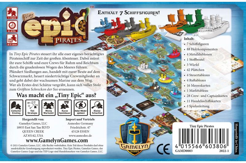 In Tiny Epic Pirates übernimmt jeder Spieler die Kontrolle über ein Piratenschiff mit dem Ziel, große Mengen an Reichtümern auf geheimen Inselverstecken zu vergraben. Pro Zug stehen den Spielern fünf verschiedene Aktionen zur Verfügung: Plündern, Handeln, Besatzung aufstocken, Angreifen oder Suchen. Am Ende gewinnt, wer drei Schätze vergraben oder – bei Gleichstand – das meiste Gold hat.