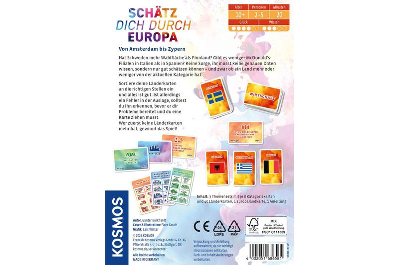 Welches Land in Europa hat die längste Küste? Wo stehen die höchsten Hochhäuser? Bei diesem Schätzspiel kommt es aufs Bauchgefühl an: Länder in spannenden Kategorien richtig einordnen und dabei immer wieder ins Grübeln kommen. Wer traut sich, die Schätzungen in der Auslage anzuzweifeln? Zwei bis fünf Spielerinnen und Spieler ab zehn Jahren versuchen in drei Themensets mit je sechs Kategorien ihre Länderkarten richtig einzusortieren und dabei die Fehler der anderen zu entdecken. Ein Spiel voller Spielspaß und interessanter Erkenntnisse für die ganze Familie!