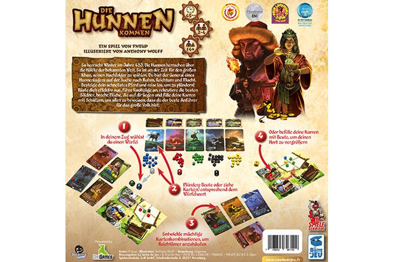 2 bis 4 hunnische Plünderer ab 14 Jahren wetteifern in Fneups "Die Hunnen kommen" um die Nachfolge des Khans. Dazu musst du eine Balance zwischen gesammelten Kartenfähigkeiten und geplünderten Ressourcen finden. Alles in einem schnellen Familienspiel, bei dem es zuweilen ein wenig gemeiner zugeht ...