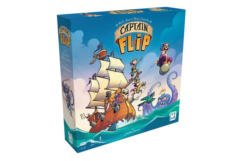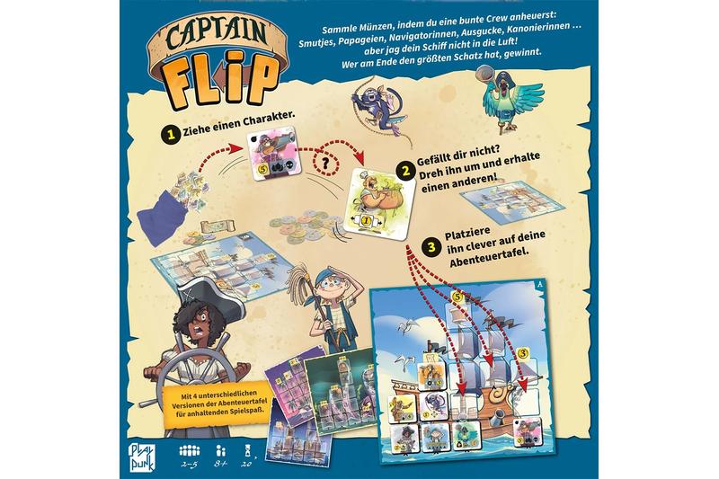 Im kurzweiligen Familienspiel Captain Flip ist es als Captains von Piratenschiffen eure Aufgabe, eine bunte Crew anzuheuern und die meisten Münzen zu sammeln. Dabei zieht ihr Plättchen mit Charakteren aus dem Beutel und platziert sie clever auf eurer Abenteuertafel. Ihr seid nicht zufrieden mit Smutjes, Papageien, Navigatorinnen, Augucken oder Kanoniererinnen? Dann könnt ihr durch den innovativen Flip-Mechanismus einmalig entscheiden, das Plättchen umzudrehen und einen anderen Charakter zu erhalten. Durch spannende Sofort-Effekte und Synergien könnt ihr das Beste aus eurer Crew herausholen – oder euer Schiff in die Luft jagen. Wer am Ende den größten Schatz hat, gewinnt!