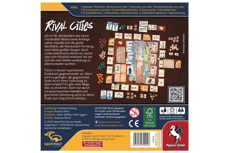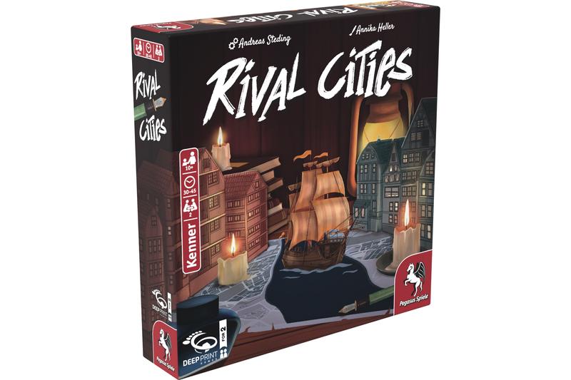 Im Stadtduell Rival Cities kommt es auf geschickt eingesetzte Ablenkungsmanöver ebenso an wie auf die richtige Einschätzung der gegnerischen Absichten. Im Laufe von maximal sieben Saisons sind die Städte immer abwechselnd am Zug. Dabei kann das Tintenfass auf ein beliebiges Feld gezogen werden, um die entsprechenden Aktionen auszuführen. Die richtige Balance zwischen Kosten und Nutzen ist hier entscheidend, denn weite Wege Kosten mehr Waren. Aktionen wie Produktion oder Warentausch füllen das eigene Lager, während eine Spende zu den punktebringenden Sternmarkern verhelfen kann. Ob diese jedoch wirklich etwas wert sind, wird sich nur zeigen, wenn nicht eine der Städte durch einen uneinholbaren Vorsprung in einem der vier Erfolgsbereiche – Ansehen, Prozesse, Schiffe oder Bündnisse – den Sofortsieg erlangt.