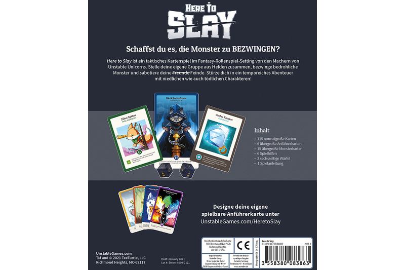 Here to Slay ist ein kompetitives und strategisches Kartenspiel mit Rollenspiel-Charakter. Es geht darum eine Gruppe von Helden aufzustellen, gefährliche Monster zu besiegen und sich gegen die Sabotageversuche seiner Widersacher zu wehren.