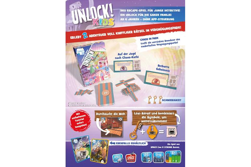 Unlock! Kids: Chaos im Park ist ein Einzelszenario mit zwei Abenteuern und erschien ursprünglich als Teil der Unlock! Kids: Detektivgeschichten-Box.
