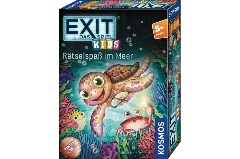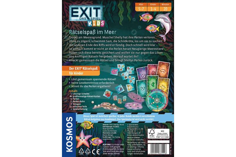 Taucht ein in das Abenteuer am Meeresgrund! Muschel Shelly hat ihre funkelnden Perlen verloren, doch Sam die Schildkröte macht sich mit ihr auf die Suche. Am anderen Ende des Riffs warten neugierige Meeresbewohner, die die Perlen nur gegen knifflige Rätsel herausgeben. Gemeinsam können ein bis vier Spielerinnen und Spieler ab fünf Jahren diese spannenden Aufgaben lösen und Sam helfen, die Perlen zurückzuergattern! Sechs immer wieder neu kombinierbare Rätsel-Arten erwarten die ein bis vier Kinder. Das Spielmaterial bleibt erhalten, so ist EXIT® - Das Spiel für Kinder immer wieder wiederspielbar.