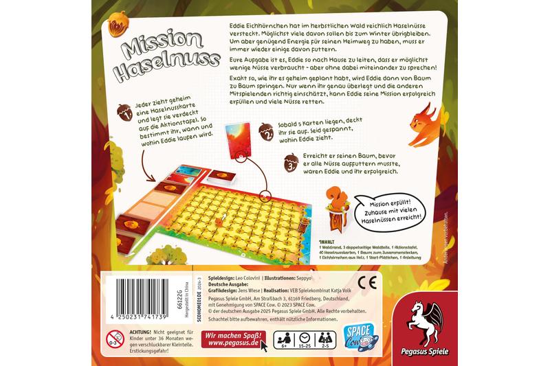 In dem kooperativen Mission Haselnuss ist es Aufgabe der Spielenden, das Eichhörnchen Eddie zurück zu seinem Nest zu führen und dabei möglichst wenige seiner Nussvorräte aufzubrauchen. In jeder Runde bewegen sie Eddie mit Haselnusskarten, die verschiedene Richtungen angeben, durch den Wald. Hierzu platzieren die Spielenden je eine Haselnusskarte verdeckt und ohne Absprache mit den anderen auf der Aktionstafel. Am Rundenende werden alle Karten von links nach rechts abgehandelt. Haben sich die Spielenden gegenseitig gut eingeschätzt, schafft Eddie es nach Hause bevor seine Haselnüsse ausgehen