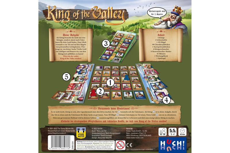 Es ist nicht leicht, ein König zu sein – aber irgendjemand muss den Job ja übernehmen. Doch was wäre ein König ohne Untertanen? Auf Berg und Tal wimmelt es von potenziellen Gefolgsleuten! Königinnen, Ritter und Bauern: Sie alle suchen nach einem charismatischen Anführer. Findest du die richtige Taktik, um sie für deine Sache zu gewinnen? Um der wahre King of the Valley zu werden, musst du am Ende dieses Familienspiels am meisten Ansehen genießen. Dazu bewegst du deine Figur über das Tableau mit den Untertanen-Plättchen und rekrutierst sie. Doch Achtung: Auch deine Gegner werden versuchen, möglichst viele Untertanen zu bekommen! Verschaffe dir einen Vorteil, indem du das Volk aus den Hügeln mit Gold auf deine Seite ziehst, Steuern eintreibst und stärkere Ritterorden als deine Mitspieler hast.