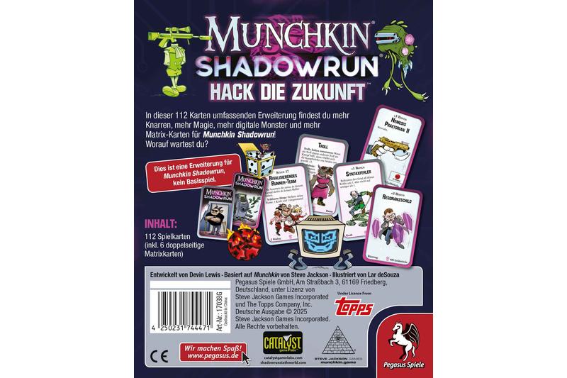 Hack die Zukunft ist eine Erweiterung. Zum Spielen wird das Grundspiel Munchkin Shadowrun benötigt.