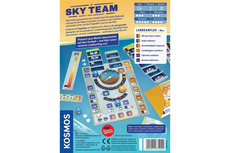 Bereit zur Landung? In dem kooperativen Spiel schlüpft ihr zu zweit in die Rollen einer Pilotin und eines Co-Piloten, die gemeinsam ein Flugzeug steuern. Ziel ist es, das Flugzeug sicher auf verschiedenen Flughäfen weltweit zu landen. Dafür müsst ihr eure Würfel geschickt den richtigen Feldern im Cockpit zuordnen, um das Flugzeug auszubalancieren, die Geschwindigkeit zu kontrollieren, die Landeklappen und das Fahrwerk auszufahren und den Tower zu kontaktieren. Stellt sicher, dass der Flugraum auch tatsächlich frei ist und vor allem: Verfehlt ja nicht die Landebahn! Von Montreal bis Tokio - jeder Flughafen hat seine eigenen Landebedingungen. Beweist euer Können als eingespieltes Team am Steuer des Jumbo-Jets. Seid ihr bereit für den Nervenkitzel? Dann erlebt Sky Team - das ultimative Spiel für angehende Piloten und Pilotinnen ab 12 Jahren.