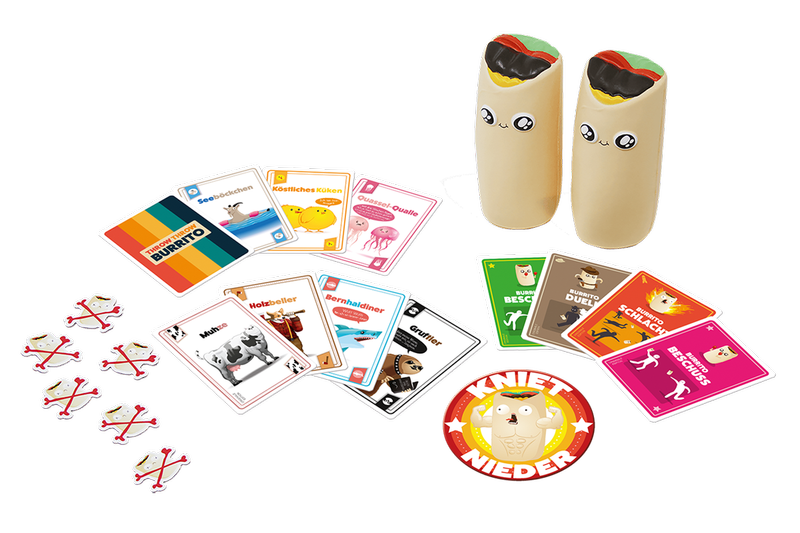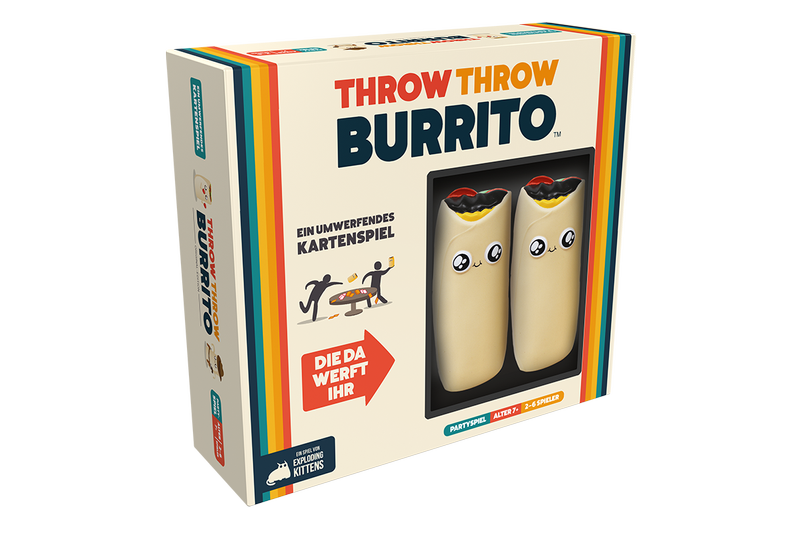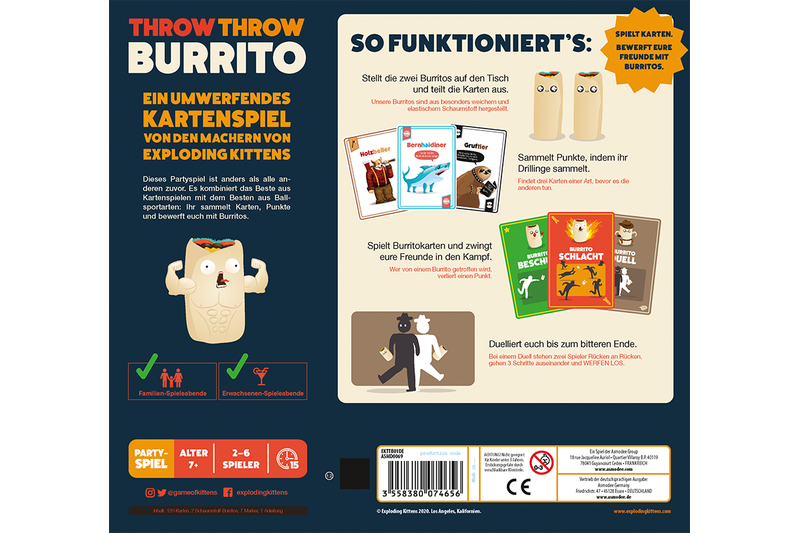 Das hier ist kein gewöhnliches Kartenspiel, denn ihr werdet eure Freunde und Familien mit knautschigen Burritos bewerfen. Macht also Platz, stellt eure Gläser beiseite und räumt das Essen und Porzellan weg … Es wird chaotisch.