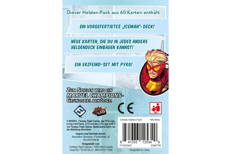 Im Helden-Pack Marvel Champions: Das Kartenspiel – Iceman finden die Spieler Iceman, seine 15 heldenspezifischen Karten und ein komplettes Sortiment an Karten des Aggressionaspekts, die die Spieler einladen, Bösewichte auf Eis zu legen. Dieser Helden-Pack enthält außerdem ein modulares Begegnungsset mit Sauron.