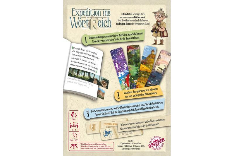 Expedition ins WortReich ist ein kooperatives Familienspiel, bei dem die Spieler als Mitglieder des staatlichen Wortschatzamtes eine Forschungsreise durch ein beliebiges Buch aus ihrem Bücherregal unternehmen, um gemeinsam in die Tiefen des Sprachdschungels vorzudringen. In jeder Runde assoziiert ein Navigator eine kurze Textstelle mit einem von vier ausliegenden, wunderschön illustrierten Lesezeichen und die Gruppe muss erraten, welche Illustration gewählt wurde. Doch beim Vorlesen lauern Gefahren und die Sprachlandschaft hält unzählige Wunder bereit...