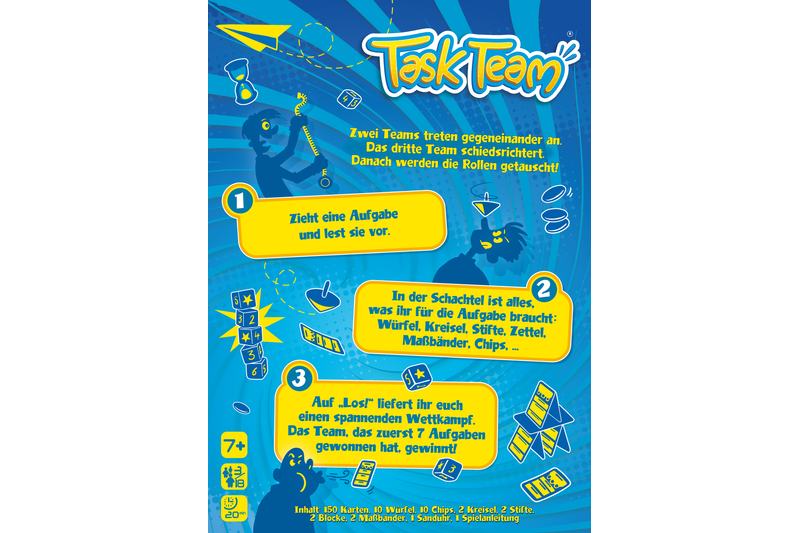 Task Team ist unser neues spaßiges Partyspiel. In Task Team stellt ihr euch unterschiedlichen Aufgaben. Nutzt dabei Würfel, Kreisel, Maßbänder und mehr, um mit eurem Team zu gewinnen. Seid bereit für 150 spaßige Minispiele, die Geschicklichkeit, Teamgeist und Schnelligkeit erfordern.