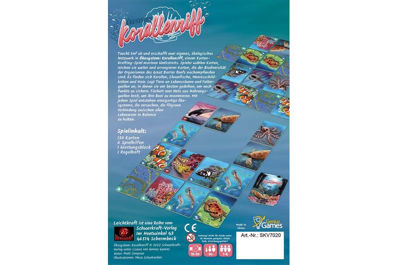 Taucht tief ab und erschafft euer eigenes, ökologisches Netzwerk in Ökosystem: Korallenriff, einem Karten-Drafting-Spiel marinen Wettstreits. Spieler wählen Karten, reichen sie weiter und arrangieren Karten, die der Biodiversität der Organismen des Great Barrier Reefs nachempfunden sind. Es finden sich Korallen, Clownfische, Meeresschildkröten und Haie. Legt Tiere an Lebensräume und Futterquellen an, in denen sie am besten gedeihen, um euch Punkte zu sichern. Fächert euer Netz aus Nahrungsquellen breit, um ihre Boni zu maximieren. Mit jedem Spiel entstehen einzigartige Ökosysteme, die versuchen, die filigrane Verbindung zwischen allen Lebewesen in Balance zu halten.