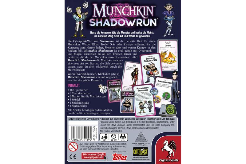 Die Cyberpunk-Welt von Shadowrun ist die perfekte Welt für einen Munchkin. Werdet Elfen, Trolle, Orks, oder Zwerge, während ihr die Konzerne zum Narren haltet, Monster tötet und eurem Kumpel in den Rücken fallt. Munchkin Shadowrun ist prall gefüllt mit Cyberpunk und Magie. Zusätzlich zu all den krassen Türen und Schätzen, die du bei Munchkin zurecht erwartest, führ Munchkin Shadowrun die Matrixkarten ein - eine neue Art von Karten, die dich gewinnen lassen, wenn du dich erfolgreich durch die Matrix hackst!