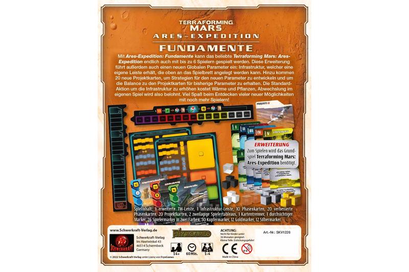 Mit Ares-Expedition: Fundamente kann das beliebte Terraforming Mars: Ares- Expedition endlich auch mit bis zu 6 Spielern gespielt werden. Diese Erweiterung führt außerdem auch einen neuen Globalen Parameter ein: Infrastruktur, welcher eine eigene Leiste erhält, die oben an das Spielbrett angelegt werden kann. Hinzu kommen 20 neue Projektkarten, um Strategien für den neuen Parameter zu entwickeln und um die Balance zu den Projektkarten für bisherige Parameter zu erhalten. Die Standard- Aktion um die Infrastruktur zu erhöhen kostet Wärme und Pflanzen, Abwechslung im eigenen Spiel wird also belohnt. Viel Spaß beim Entdecken vieler neuer Möglichkeiten mit noch mehr Spielern!