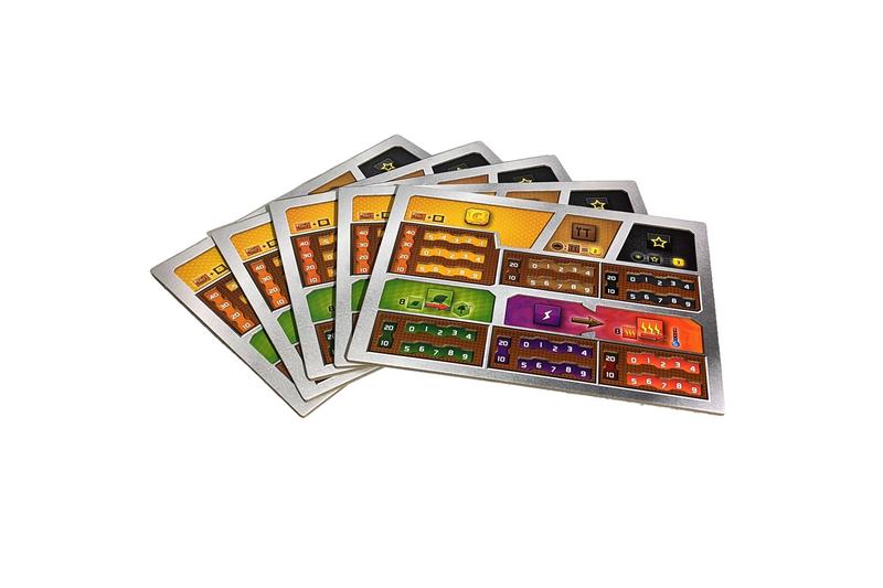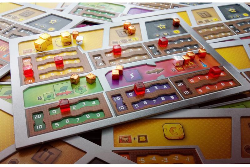 Diese Deluxe-Spielertableaus bestehen aus zweilagigem Karton mit einer Dicke von insgesamt 3mm. Die obere Lage ist so ausgestanzt, dass die Spieler ihre Spielermarker für die einzelnen Produktionen sowie ihre Ressourcenmarker sicher darin unterbringen können. So verrutscht nichts, falls jemand versehentlich an den Tisch stößt. Außerdem haben diese Tableaus zusätzliche Felder für eine Produktion von 10 und 20, wodurch sich höhere Werte einfacher darstellen lassen. Damit geht ein Wunsch vieler Fans in Erfüllung!