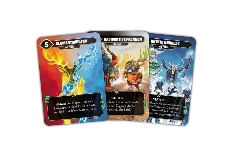 "Schließe dich mit deinem Teampartner zusammen und erlebe intensive, rasante taktische Mindbug-Mehrspieler-Duelle.Kombiniere die neuen 2vs2 Tag-Team-Karten mit einem beliebigen bestehenden Mindbug-Set für ein unglaubliches 2vs2-Erlebnis.