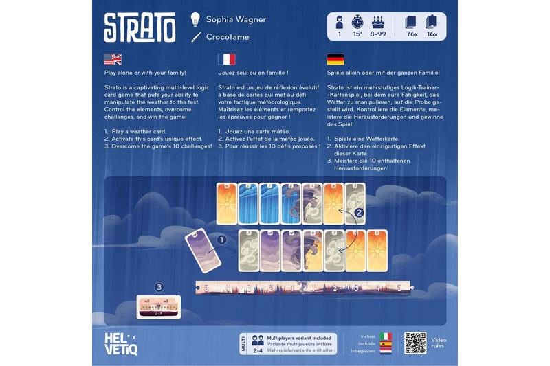 In Strato spielt ihr als Team zusammen, um die immer komplexer werdenden Herausforderungen des Spiels zu meistern. Jongliert mit den Elementen, um die vorgegebenen Bedingungen zu erfüllen, bevor euch die Karten ausgehen. Ihr legt der Reihe nach einer Karte auf den Tisch und aktiviert ihren jeweiligen Effekt. Ihr könnt die bereits liegenden Karten verschieben, um sie an der richtigen Stelle zu platzieren. Aber passt auf: Wenn ihr die Elemente nicht im Griff habt, können die Effekte auch nach hinten losgehen. Strato ist ein Strategiespiel mit steigendem Schwierigkeitsgrad. Arbeitet eng zusammen, um eure Ziel zu erreichen.