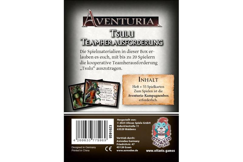 Aventuria – Teamherausforderung: Tsulu ist ein kooperatives Gruppenabenteuer für bis zu 20 Spieler. In dieser voll-kooperativen Erweiterung treten mehrere Heldengruppen parallel gegen eine gewaltige Bedrohung an, die von einem gemeinsamen Gegner geführt wird.