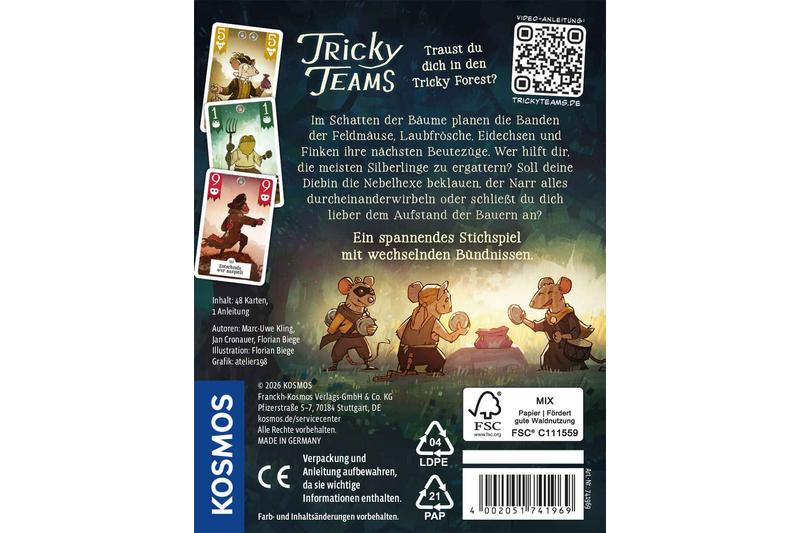 Maus-, Echse-, Fink- und Froschkarten liegen bereit, die Tierteams warten auf ihren Einsatz – doch wer gewinnt? In jeder Stichrunde entstehen neue Allianzen, und jede Entscheidung kann den Spielverlauf verändern. Vier witzig illustrierte Tierteams mit Zahlenwerten von 1 bis 10 bringen Atmosphäre auf den Tisch, während ihre Spezialfunktionen für unerwartete Wendungen sorgen. Wer clever spielt und im Gewinnerteam landet, sammelt Punkte, bis die Zielzahl erreicht ist. Flinke Runden halten die Spannung hoch und machen das Spiel zu einem unterhaltsamen Erlebnis für Familien, Freundeskreise und alle, die Teamgeist mit ein wenig Strategie verbinden möchten.