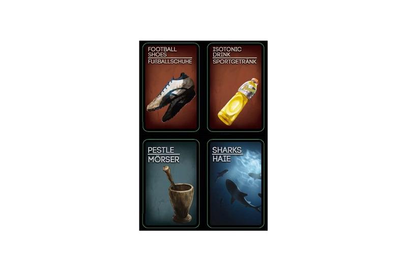 Das Themen-Pack beinhaltet: Jeweils 10 Indizien -und Tatwaffenkarten: Kokosnuss, Kokosnuss-Öffner, Elektrisches Trio, Schweres Essen, Matkot Schläger, Stößel, Haie, Spieß, Surfbrett, Volleyball Netz, Berimbau, Karnevalshemd, Elektronische Wahlmaschine, Falscher Schnurrbart, Fußballschuhe, Isotonisches Getränk, Steckeradapter, Silikonprothese, Sonnencreme, Spuren vergangener Verbrechen
