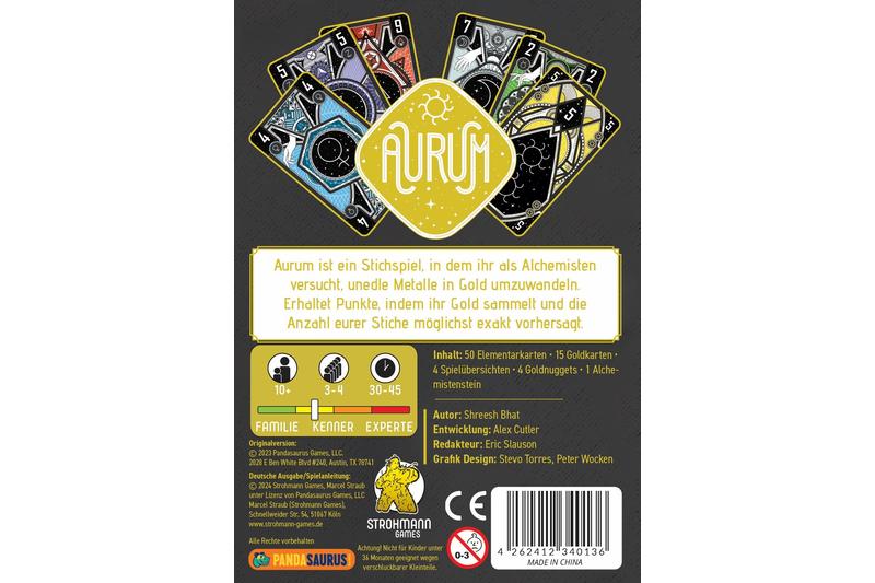 Aurum ist ein kompetitives Stichspiel, in dem ihr Alchemisten spielt, die unedle Basismetalle in Gold umwandeln. Ihr verdient Punkte, indem ihr Gold sammelt und erfolgreich vorhersagt, wie viele Stiche ihr gewinnen werdet. Am Ende des Spiels gewinnt, wer die meisten Punkte sammeln konnte.
