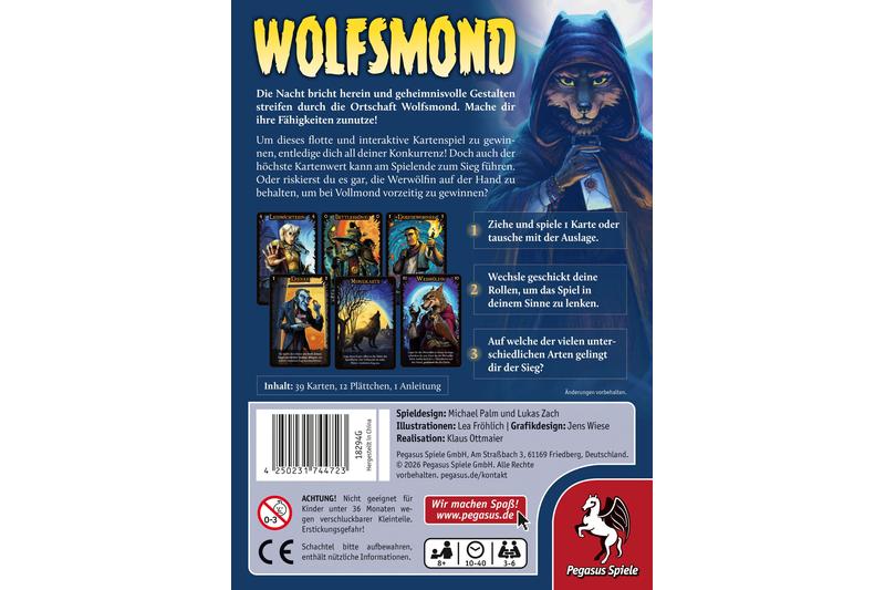 Bei dem interaktiven Kartenspiel Wolfsmond wandelt eine mächtige Werwölfin unter den teils aufrichtigen, teils zwielichtigen Charakteren. Während die Nacht voranschreitet und der Vollmond am Nachthimmel aufsteigt, werden Intrigen gesponnen, Deals ausgehandelt und Bluffs entlarvt. Wer schafft es, mit einem einflussreichen Charakter unerkannt zu bleiben?