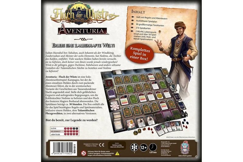 Aventuria: Fluch der Wüste ist ein episches Solo-Abenteuerbrettspiel, das dich durch zwei aufwendig erzählte Abenteuer voller orientalischer Magie, Gefahren und Entscheidungsmöglichkeiten führt. Inspiriert von den Geschichten aus Tausendundeiner Nacht steuerst du einen Helden durch verwinkelte Paläste, finstere Zaubertürme und geheimnisvolle Orte.