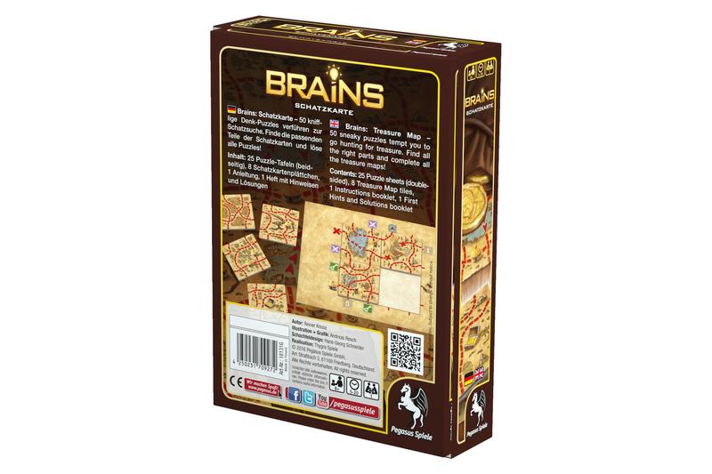 Wie der erste Teil der Brains-Reihe, Japanischer Garten, stellt auch Brains - Schatzkarte die Spieler vor spannende Logikrätsel: Es wird vorgegeben, welche Bedingungen ein vollendeter Plan erfüllen muss, aber welche Wegplättchen dafür benötigt werden und wie sie ausgelegt werden müssen, muss der Spieler alleine herausfinden. In jeweils 50 kniffligen Denk-Puzzles gilt es daher, die Weg-Plättchen so auf den Knobelvorlagen auszulegen, dass alle Rahmenbedingungen erfüllt werden. Aber was so leicht klingt, bringt selbst helle Köpfe zum Qualmen. Selten lagen einfach und verzwickt so nah beisammen wie in Brains. Schnell verstandene Regeln und die zunehmende Schwierigkeit wissen Knobelfreunde zu fesseln. Also Vorsicht: Suchtgefahr!