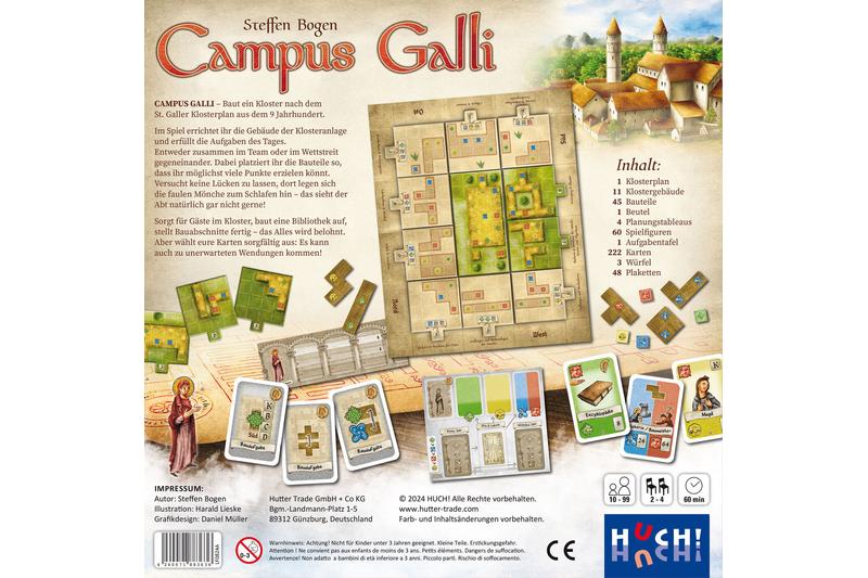 Im Spiel vollendet ihr die Gebäude der Klosteranlage und erfüllt die Tagesaufgaben. Entweder zusammen im Team oder im Wettstreit gegeneinander. Dabei platziert ihr die Bauteile so, dass ihr möglichst viele Punkte erreichen könnt. Versucht keine Lücken zu lassen, dort legen sich die faulen Mönche zum Schlafen hin - und das sieht der Abt natürlich gar nicht gerne! Sorgt für Gäste im Kloster, baut die Bibliothek auf, stellt Bauabschnitte fertig - das Alles wird belohnt. Aber wählt eure Karten sorgfältig aus. Es kann auch zu unerwarteten Wendungen kommen!