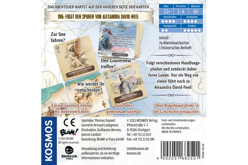 Tibet, 1916: Auf den Spuren der Journalistin Alexandra David-Néel geraten die 1-6 Spielerinnen und Spieler in ein aufregendes Abenteuer. Es geht über Ceylon und Indien bis nach Tibet hinein ins Ungewisse. Die beiden Regelkarten führen in diesem Abenteuerspiel ins Geschehen ein, danach wird sofort losgespielt. Auf einigen Karten sind Orte zu sehen, andere stellen das Team vor Entscheidungen, die auf andere Karten verweisen und den weiteren Verlauf des Spieles beeinflussen. Karte für Karte entwickelt sich die Geschichte. Wie wird sie ausgehen? Die Spielerinnen und Spieler entscheiden in diesem Abenteuerspiel gemeinsam den Verlauf der Geschichte. Auf ins Abenteuer!