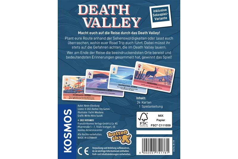 Wunderschönes Kartenspiel mit Can‘t Stop Mechanismus. Wer sammelt die meisten Punkte beim Trip durch das weltbekannte Tal des Todes? Da jede Karte zudem bestimmte Eigenschaften hat, verläuft jeder Durchlauf taktisch ein wenig anders. Die 24 Karten sind ein großes Spielerlebnis!