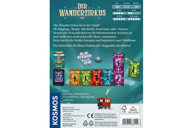 Der Zirkus ist in der Stadt! Der Wanderzirkus entführt in diesem Deckbau-Spiel in eine zauberhafte Welt voller einzigartiger Artistinnen und Artisten. In jeder Runde wird sowohl die Stadt gewählt, in der der eigene Zirkus als Nächstes gastiert, als auch eine neue Attraktion. Für jede Vorstellung muss auch eine Mindestanzahl von Artistinnen und Artisten festgelegt werden, die bei Erreichen Punkte bringt. Dann startet die Show! Dafür legen die zwei bis sechs Spielerinnen und Spieler ihre Karten nach dem Domino-Prinzip aneinander, um lange und punkteträchtige Ketten zu bilden. Im taktischen Kartenspiel ab zehn Jahren warten wundersame und spannende Wendungen: Wer sammelt die meisten Punkte und stellt die beste Zirkus-Show auf die Beine?