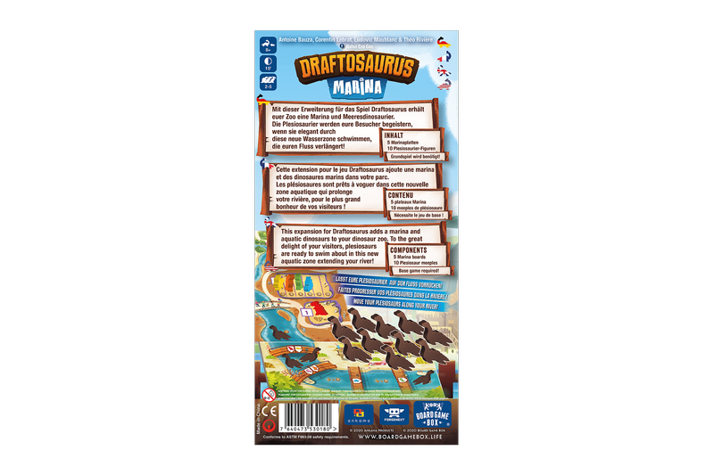 Mit dieser Erweiterung erhält euer Zoo eine neue Art: den Plesiosaurus. Dieser Wassersaurier lebt in der neuen Marina und mit ihm können viele Zusatzpunkte erzielt werden. Die Plesioaurier leben im Wasser in der Marina auf dem neuen Spielbrett.