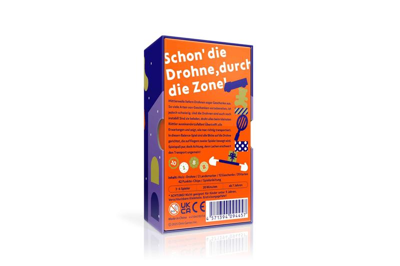 Mittlerweile liefern Drohnen sogar Geschenke aus. So viele Arten von Geschenken vorzubereiten, ist jedoch schwierig. Und die Drohnen sind auch noch instabil! Sind sie beladen, droht alles beim kleinsten Rüttler auseinanderzufallen! Übertrefft alle Erwartungen und zeigt, wie man richtig transportiert. In diesem Balance-Spiel sind alle Blicke auf die Drohne gerichtet, die auf Fingern zweier Spieler bewegt wird. Spielspaß pur, doch Achtung, denn Lachen erschwert den Transport ungemein!