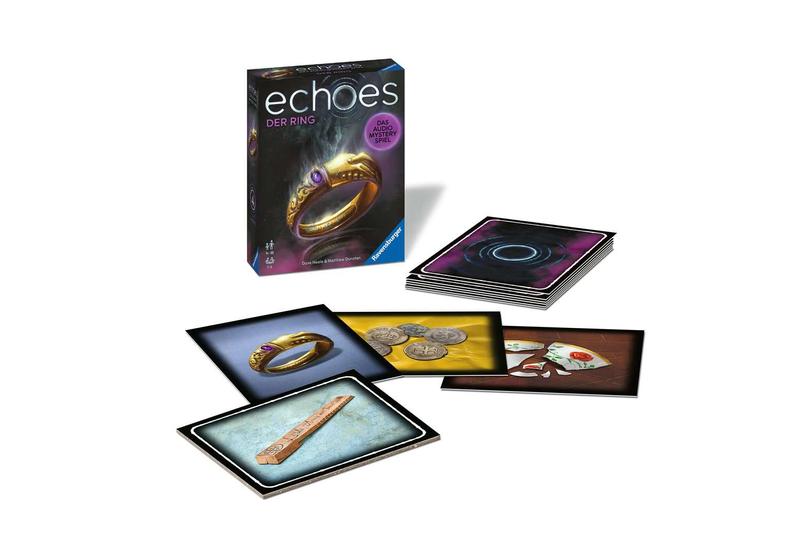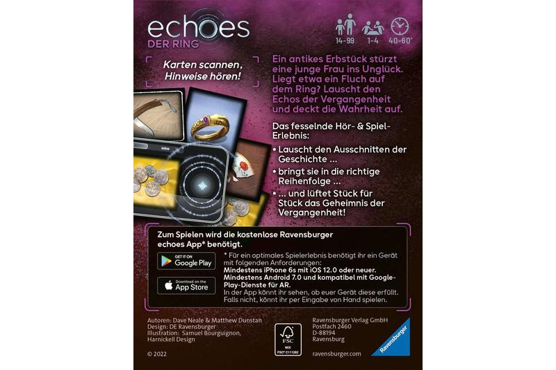 Ein antiker Ring stürzt eine junge Frau ins Unglück. Liegt etwa ein Fluch auf dem Ring? Das Echo der Vergangenheit birgt die Wahrheit, was es mit dem Ring auf sich hat. echoes ist ein einzigartiges, kooperatives Audio Mystery Spiel. Die Spieler hören mithilfe der kostenlosen Ravensburger echoes App mysteriöse Geräusche und Stimmen, die mit den Kartenmotiven verbunden sind. Gemeinsam bringen sie die 24 Teile der Geschichte in die richtige Reihenfolge, um den Fall zu lösen.