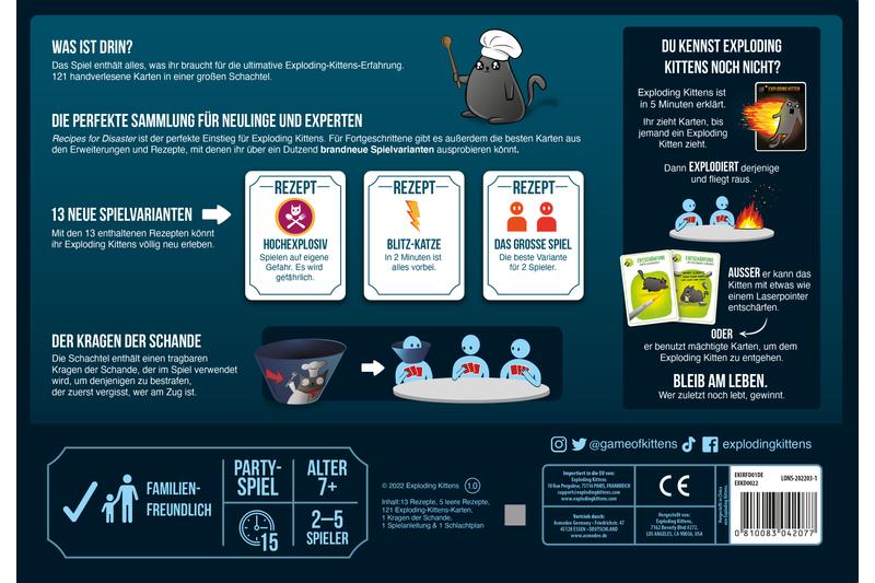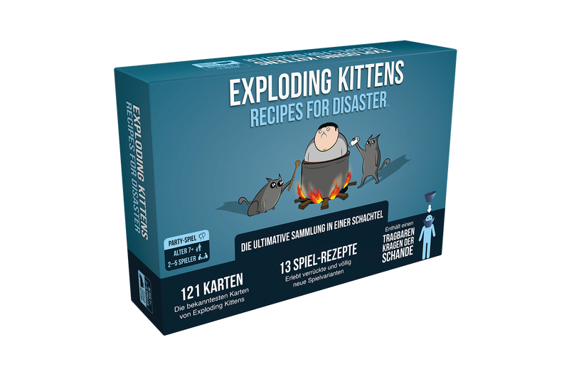 Das eigenständige Partyspiel Exploding Kittens: Recipes for Disaster enthält alles, was Spieler für die ultimative Exploding Kittens-Erfahrung brauchen. Neben 121 handverlesenen Karten aus dem Grundspiel und den bekannten Erweiterungen kehrt auch der beliebte Kragen der Schande zurück. Wer es etwas würziger mag, kann mit dem neuen Element „Rezepte“ über ein Dutzend brandneue Spielvarianten ausprobieren.