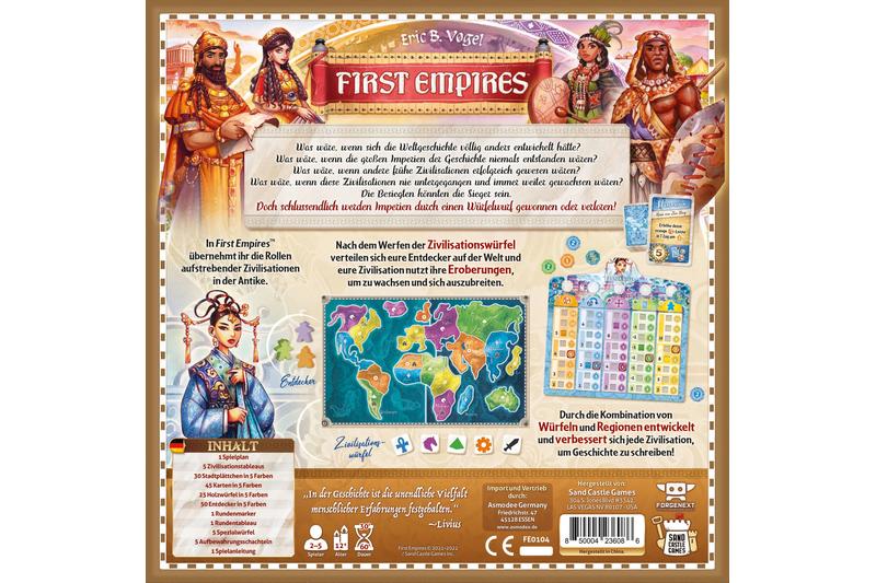 First Empires ist ein Area-Control-Spiel mit eleganten und eingängigen Regeln. Als Anführer einer aufstrebenden Zivilisation in der Antike konkurrieren die Spieler um Regionen auf dem Spielplan, errichten dort Städte und erwerben Errungenschaft-Karten. Die einzigartigen Attribute der eigenen Zivilisation müssen durch den geschickten Einsatz von Würfeln weiterentwickelt werden, um zu wachsen, sich weiter auszubreiten und die gegnerischen Regionen zu erobern.