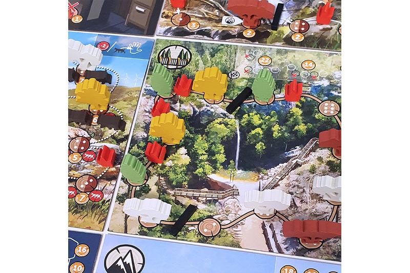 Floresta wird auf mehreren Spielplan-Tafeln gespielt, auf denen Berge, Wälder und Wege durch die Natur zu sehen sind.