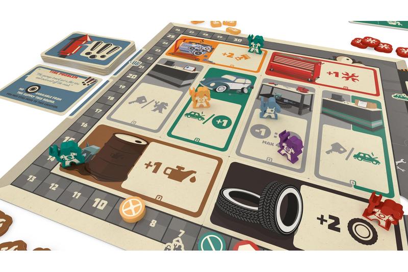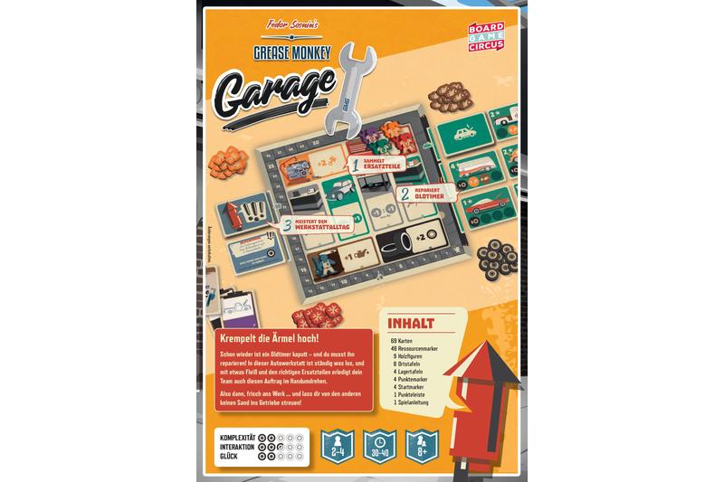 Ölverschmierte Arbeitskluft ... die Musik tönt blechern aus dem Radio hinten in der Werkstatt. Einige Schubladen stehen offen und Schraubenschlüssel, Ratsche und anderes Werkzeug ragt aus ihnen heraus. Das muss die legendäre Grease Monkey Garage sein! Schon wieder ist ein Oldtimer kaputt – und du musst ihn reparieren! In dieser Autowerkstatt ist ständig was los, und mit etwas Fleiß und den richtigen Ersatzteilen erledigt dein Team auch diesen Auftrag im Handumdrehen.Dazu müsst ihr tolle Fahrzeuge reparieren und dafür sorgen, dass ihr immer die richtigen Ersatzteile im Lager habt. Dabei will jeder Handschlag wohlüberlegt sein, denn ihr habt nur begrenzt Zeit und die Ressourcen sind knapp! Setzt eure Mechanikerinnen und Ressourcen in jeder Schicht gezielt ein. Wer nach allen Schichten die meisten Punkte und damit den besten Ruf hat, gewinnt!Also dann, frisch ans Werk … und lass dir von den anderen keinen Sand ins Getriebe streuen!