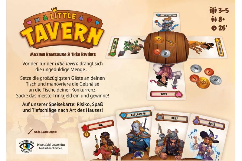 In dem Familienspiel Little Tavern deckt ihr Gästekarten auf, um diese an eurem Tisch oder den Tisch der Mitspieler zu platzieren. Jeder Gast gehört zu einem von sieben verschiedenen Clans. Jeder Clan hat seine eigenen Wünsche und gibt Trinkgeld, abhängig davon, ob diese erfüllt werden oder nicht. Mithilfe von Ereigniskarten könnt ihr euch Vorteile verschaffen und die Gästekarten an den Tischen beeinflussen. Wer das meiste Trinkgeld kassiert, gewinnt.