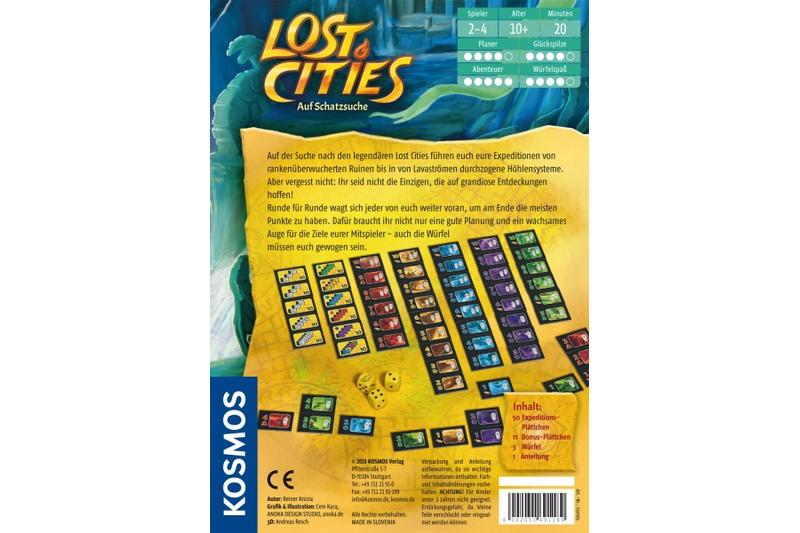 Beim Erreichen der Ziele sind Glück und Geschick gefragt: 2–4 Spieler legen mit Plättchen unterschiedliche Expeditionsrouten, die sie an entlegene Orte der Welt führen, etwa ins Gebirge, in den Regenwald oder in die Wüste. Um erfolgreich zu sein, müssen sie beim Würfeln auch ein Risiko eingehen. Doch Vorsicht: Jeder Spieler sollte auf der Hut sein – denn die Konkurrenz verfolgt die gleichen Ziele. Nach Brett- und Kartenspiel wird mit dem Würfelspiel die beliebte „Lost Cities“-Reihe um ein spannendes Gesellschaftsspiel erweitert.