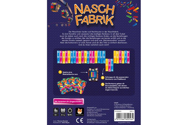 Bei Naschfabrik von Funny Fox handelt es sich um ein Familienspiel ab 8 Jahren, bei dem die Spieler in die Rolle von Konditoren schlüpfen. In dieser Rolle müssen sie Bonbon-Bestellungen entgegennehmen und die richtigen Bonbons finden, um die Bestellungen ihrer Kunden zu erfüllen. Die Bonbons haben dabei diverse Bonuseffekte, mit denen die Gegner geärgert werden können. Der Spieler, der die Bestellungen am besten erfüllt und so die meisten Punkte sammelt, gewinnt das Spiel und wird zum „Meisterkonditor“ ernannt. Durch Extra-Spielvarianten ist das Spiel aber auch für jüngere Kinder geeignet.