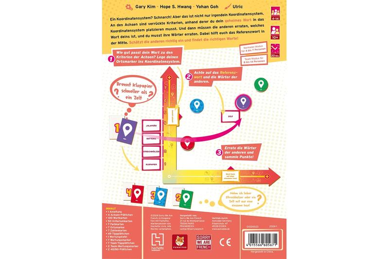 Im kompetitiven Partyspiel Orte für Worte versuchst du, Begriffe in einem verrückten Koordinatensystem am richtigen Ort zu platzieren, sodass deine Mitspieler diese erraten können. An den Achsen sind skurrile Kriterien, anhand derer du dein geheimes Wort einordnen musst. Auch das Referenzwort in der Mitte hilft dir dabei. Errate die Begriffe der anderen und gib selbst gute Hinweise, um die meisten Punkte einzuheimsen. Schätze die anderen gut ein und finde die richtigen Orte für deine Worte!