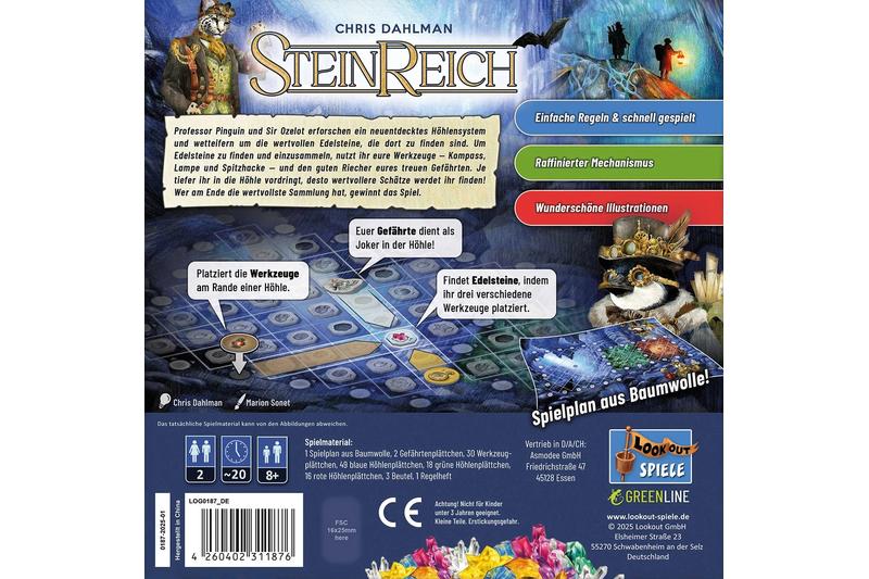 SteinReich ist ein spannendes Familienspiel für zwei Schatzgräber, die in einem geheimnisvollen Höhlensystem nach wertvollen Edelsteinen suchen. Mit cleverem Platzieren von Werkzeugen wie Spitzhacke, Kompass und Lampe deckt ihr funkelnde Schätze auf und sammelt sie ein, doch wer nicht genau hinschaut, könnte seinem Gegner einen Vorteil verschaffen! Dank des raffinierten Mechanismus, bei dem Edelsteine nur unter bestimmten Bedingungen geborgen werden können, bleibt jede Partie spannend bis zum letzten Zug. Das farbenprächtige Design, inklusive eines Spielplans aus Baumwolle, macht SteinReich zu einem echten Juwel!