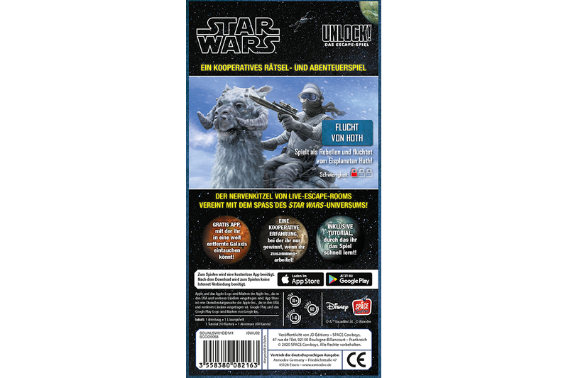 In UNLOCK! Star Wars – Flucht von Hoth erlebt ihr ein unvergessliches Escape-Abenteuer in einer weit, weit entfernten Galaxis am heimischen Spieltisch. Ihr seid Rebellen auf dem Eisplaneten Hoth und der Funkkontakt zur Basis bricht ab. Gelingt es euch der eisernen Kälte von Hoth zu entkommen? Möge die Zeit mit euch sein!