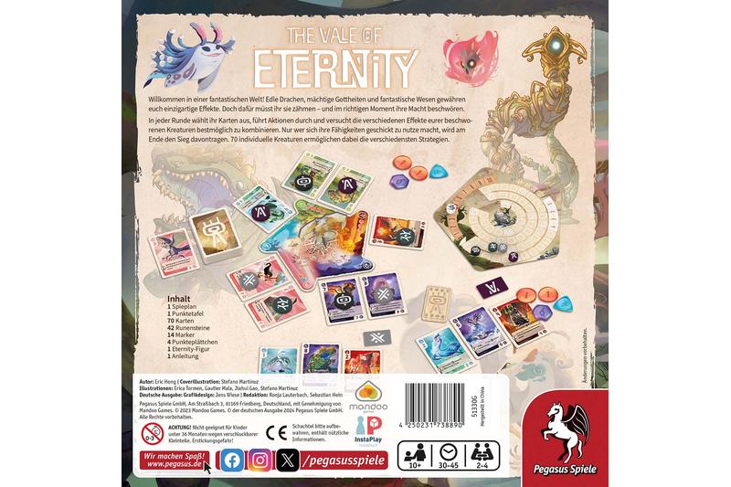 Die Welt von The Vale of Eternity ist voller magischer Kreaturen wie Riesen, Drachen, Phönixen, Nessie und vielen mehr. Als Bändiger*innen wollen die Spielenden die mächtigsten von ihnen zähmen und beschwören, um mit ihrer Hilfe die meisten Punkte zu sammeln. Insgesamt 70 Kreaturen, inspiriert von unterschiedlichen Mythologien, die unterschiedlichste Strategien erlauben, gibt es im Spiel zu entdecken.